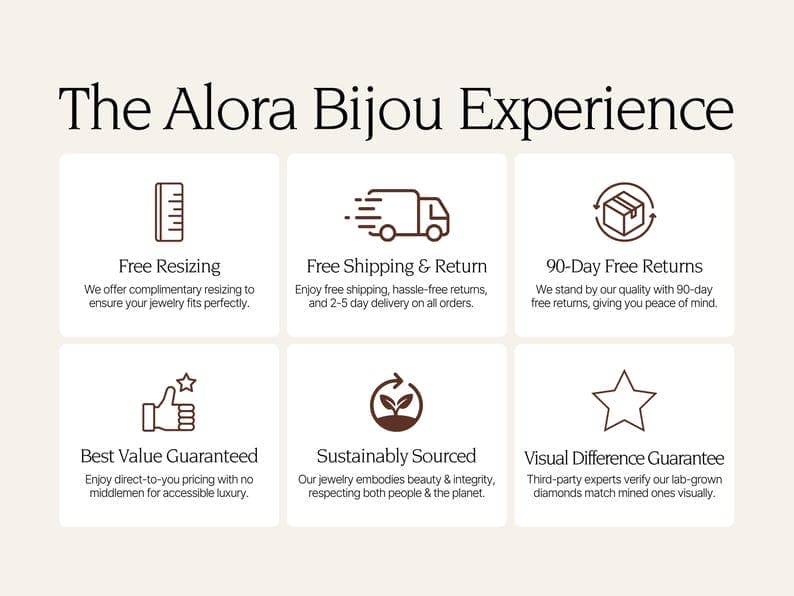 Sustainability is at the heart of everything we do. Our lab-grown diamonds are a testament to ethical craftsmanship, providing the same beauty and brilliance as mined diamonds while respecting our planet and its resources. We pay fair wages to our artisans and ensure every aspect of our production process is conducted with integrity. Choosing Alora Bijou means choosing a future where beauty and responsibility go hand in hand.