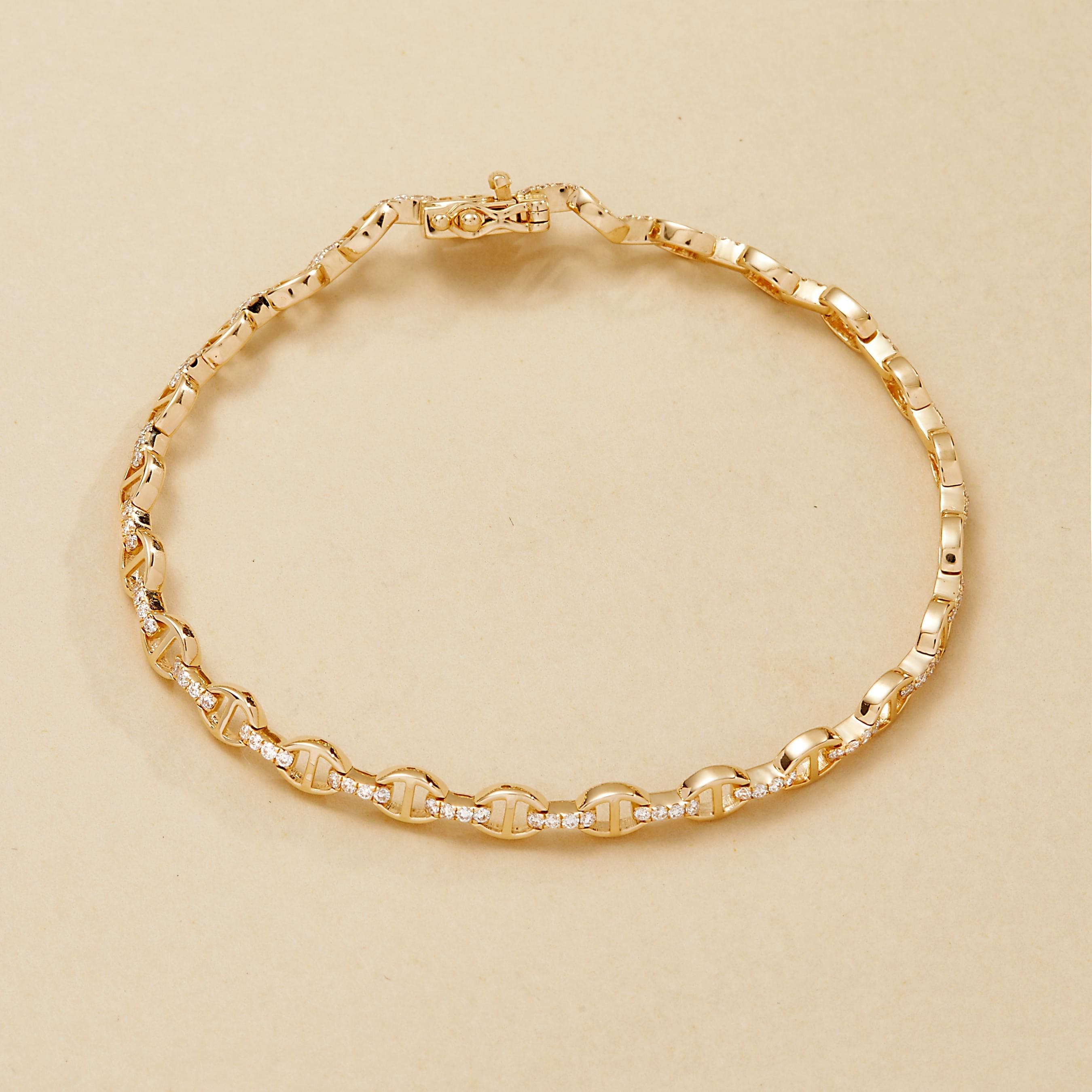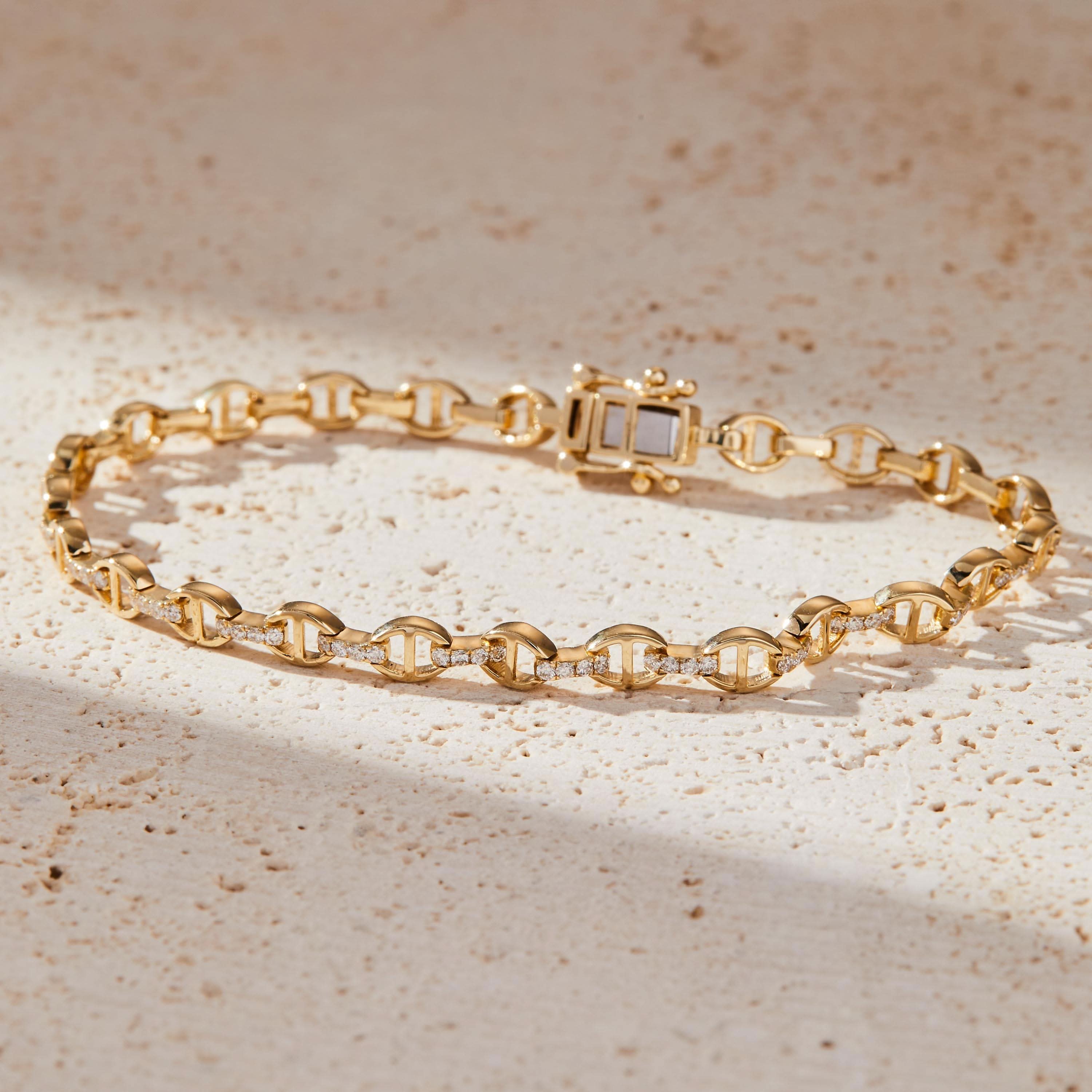 This minimalist 14k gold bracelet features 0.70 carats of lab-grown diamonds in a sleek link design. Elegant and comfortable, it’s perfect for both casual and formal occasions.