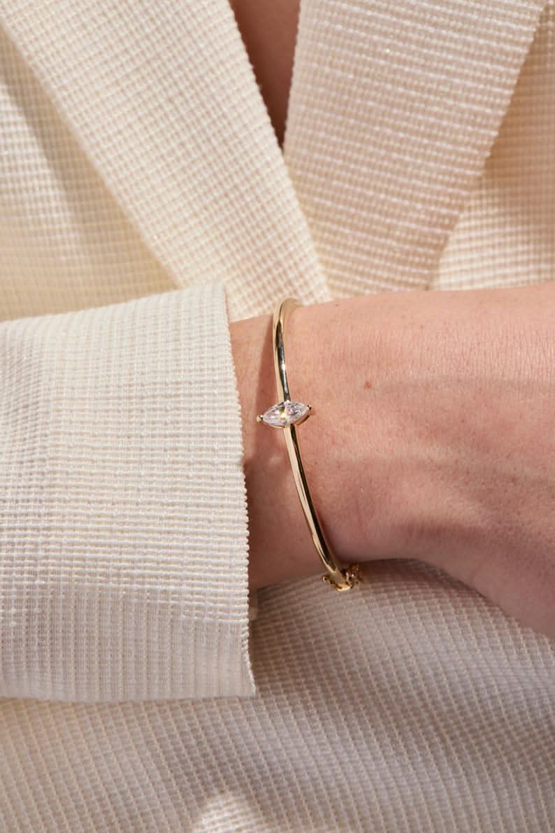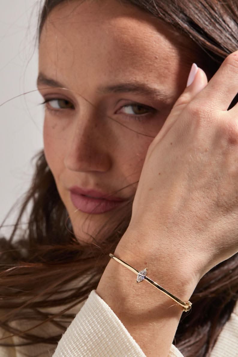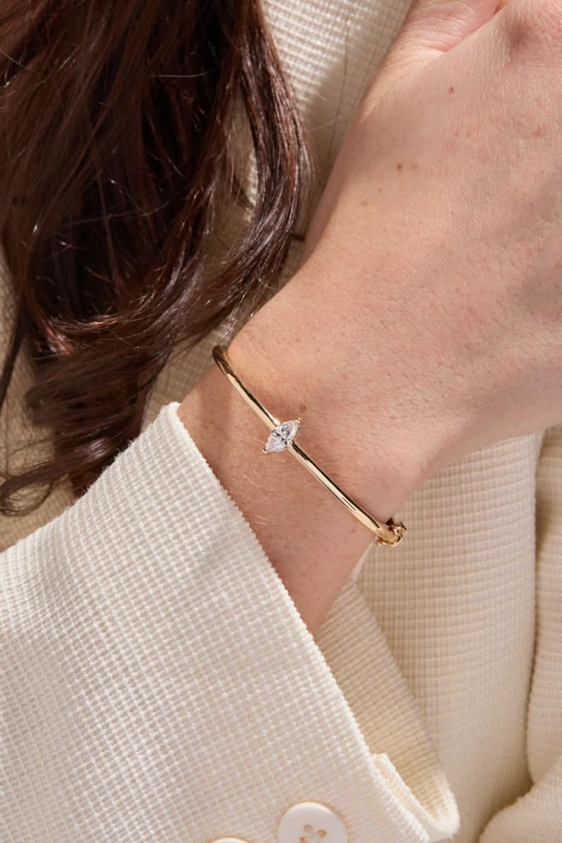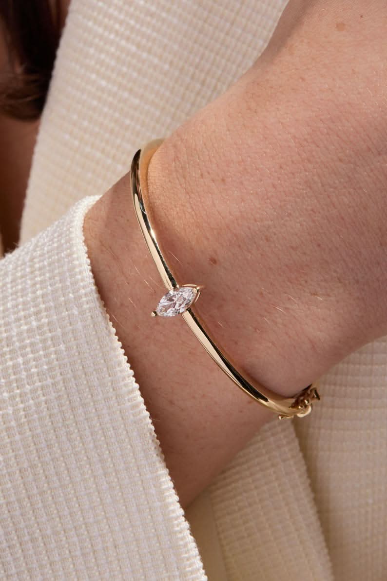 Introducing the stunning 14K Gold Bangle featuring a 0.70 Carat Marquise Lab Grown Diamond as its center stone. Designed for everyday wear, this elegant and minimalist bangle combines timeless style with modern sophistication, making it a versatile addition to any jewelry collection.