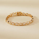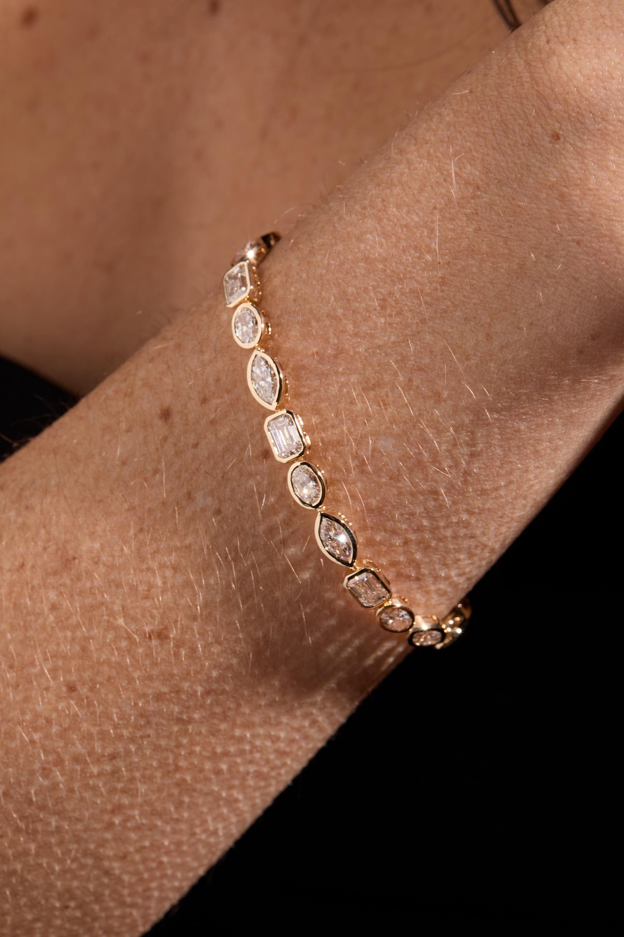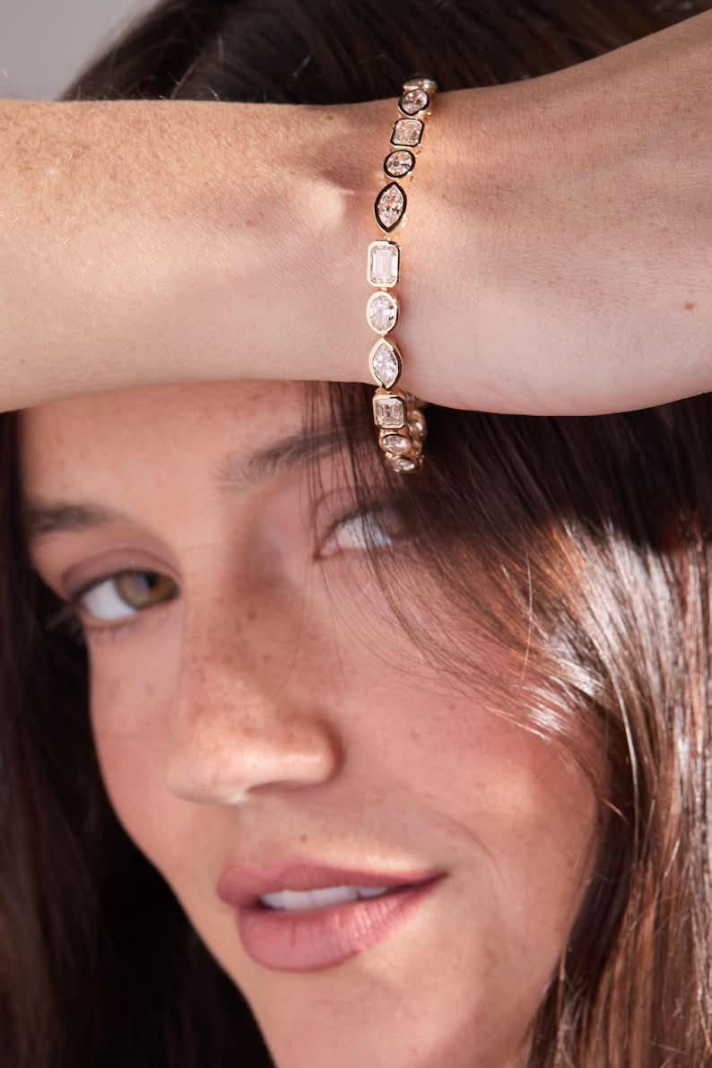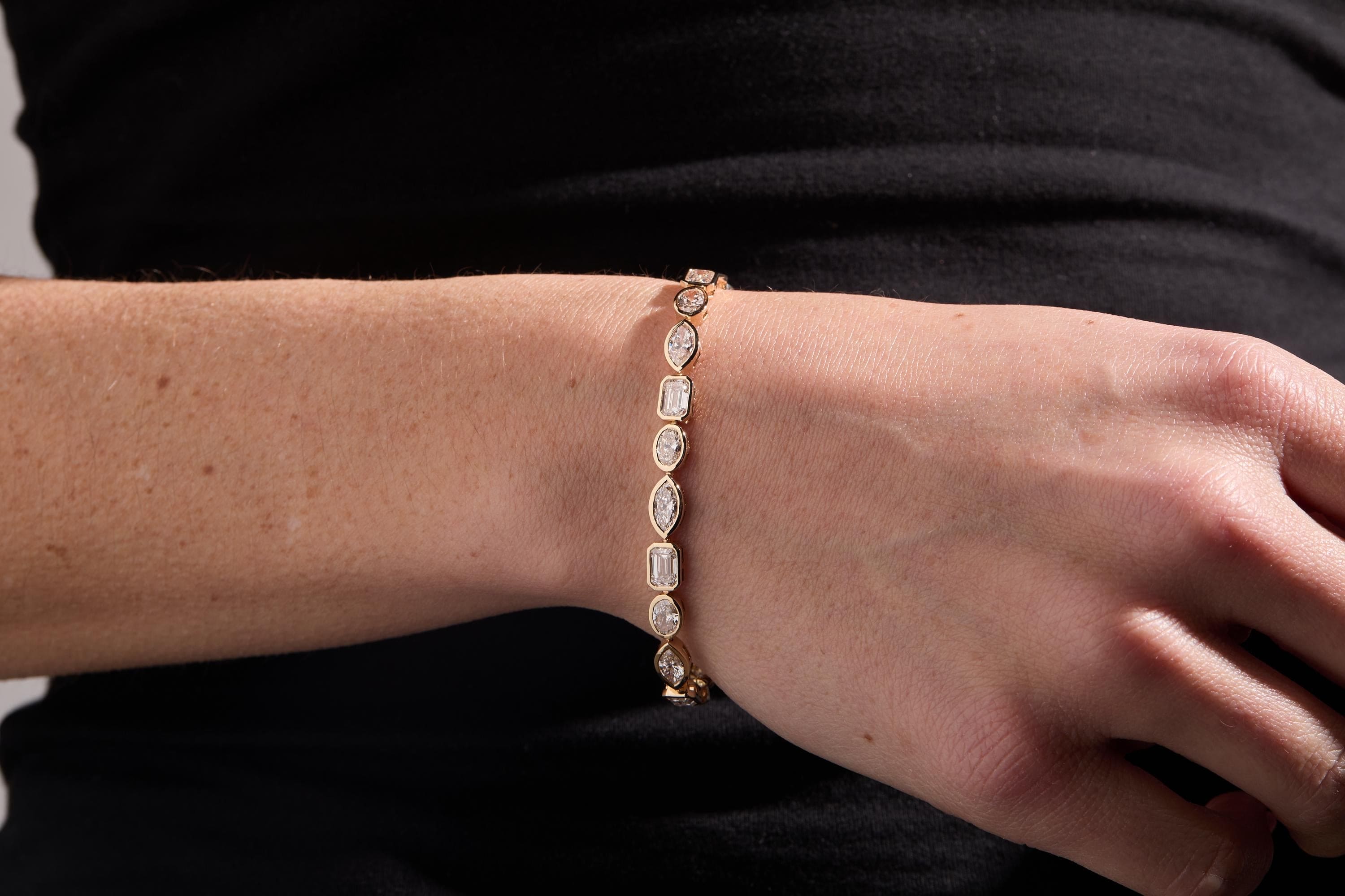Adorn your wrist with the breathtaking 11 Carat Multi-Shape Lab-Grown Diamond Tennis Bracelet. Crafted in 14K Yellow Gold, this luxurious piece features a dazzling combination of emerald, oval, and marquise cut diamonds. With E-F Color and VS-VVS Clarity, this bracelet delivers timeless elegance and unmatched brilliance.