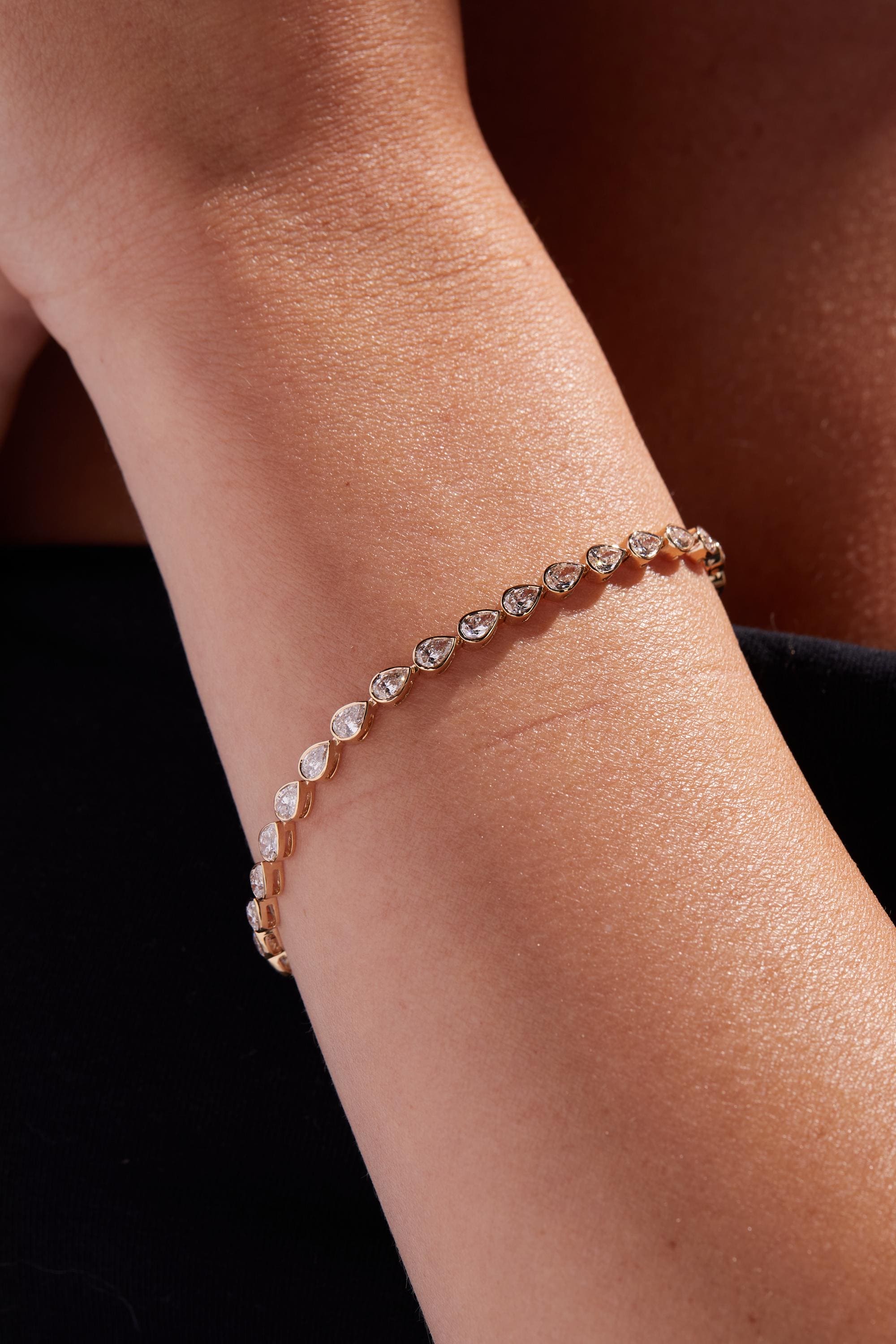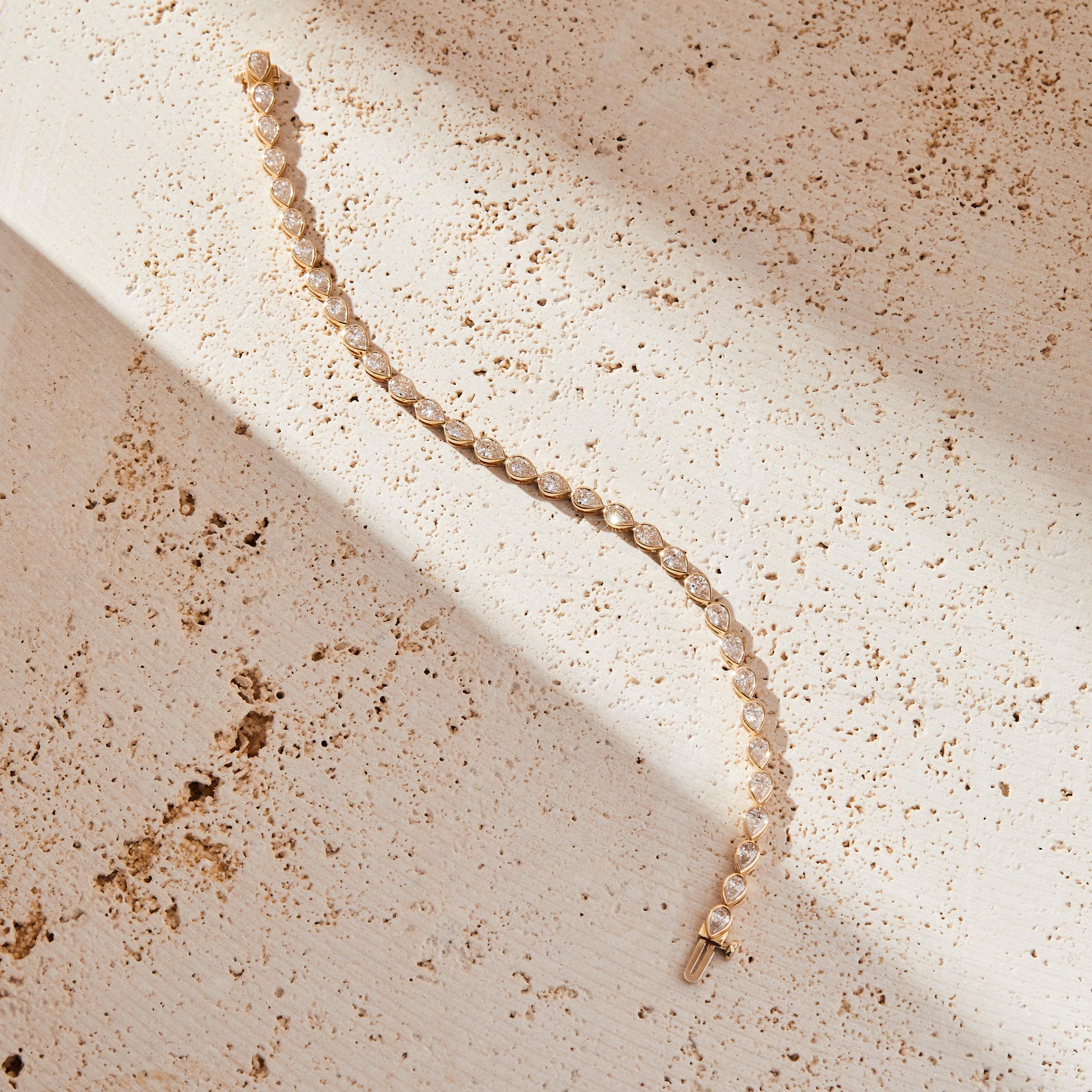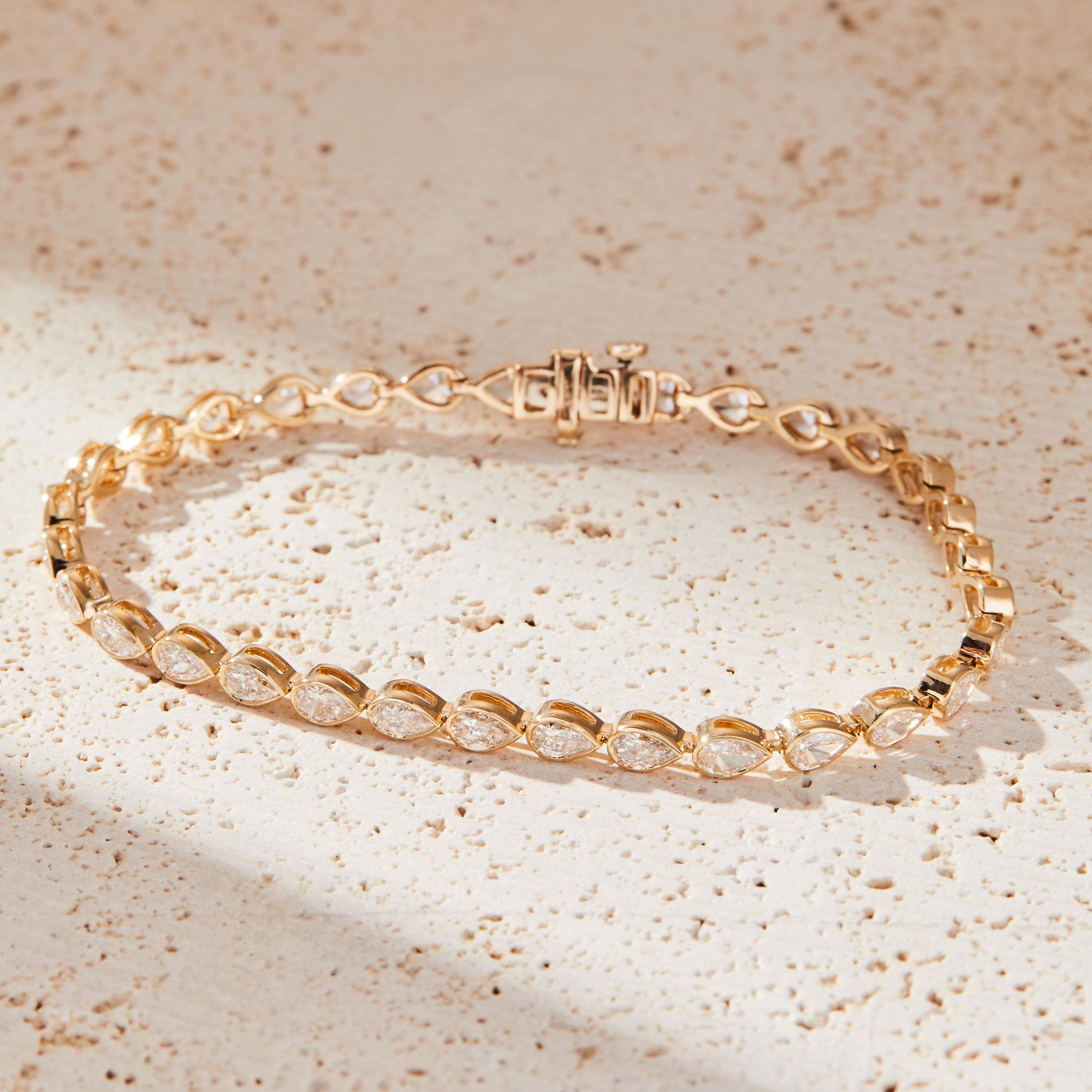 This 4.3-carat bracelet showcases pear-shaped lab-grown diamonds in a sleek bezel setting, crafted in 14K yellow gold. With its modern design and ethical diamonds, this piece exudes elegance and sustainability.