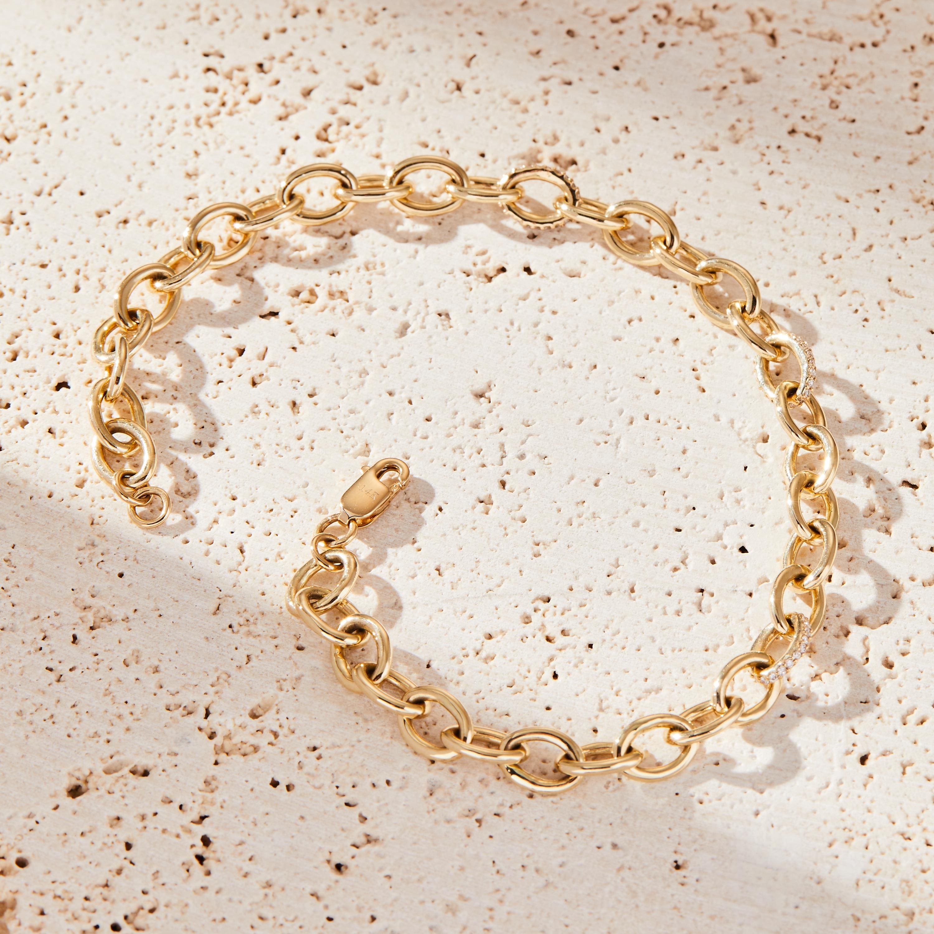 Effortlessly elevate your style with this Minimalist Gold Bracelet, featuring sleek round links accented by diamonds on three of the links. Perfectly balancing sophistication and simplicity, this versatile piece is ideal for any occasion, from casual gatherings to formal events.