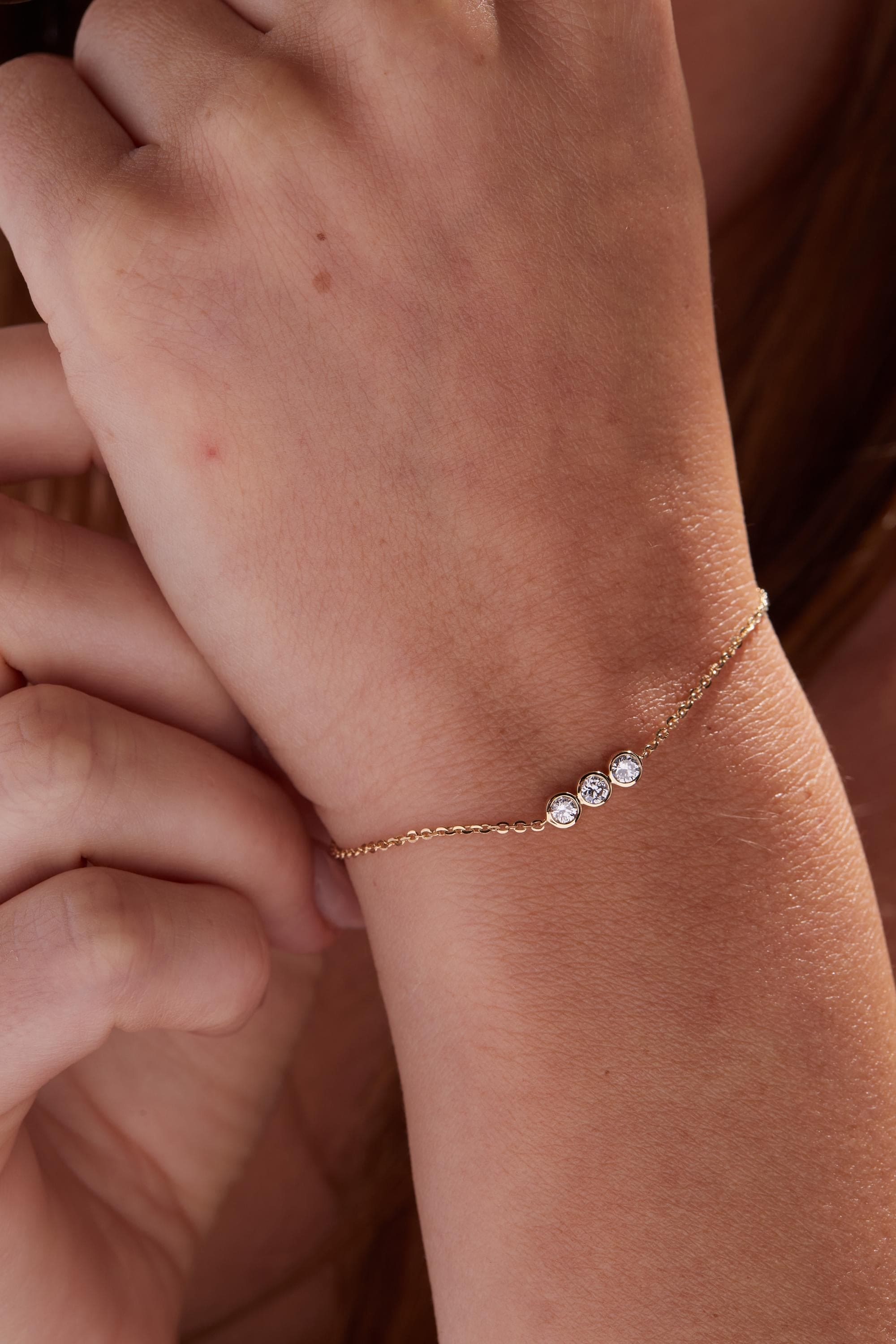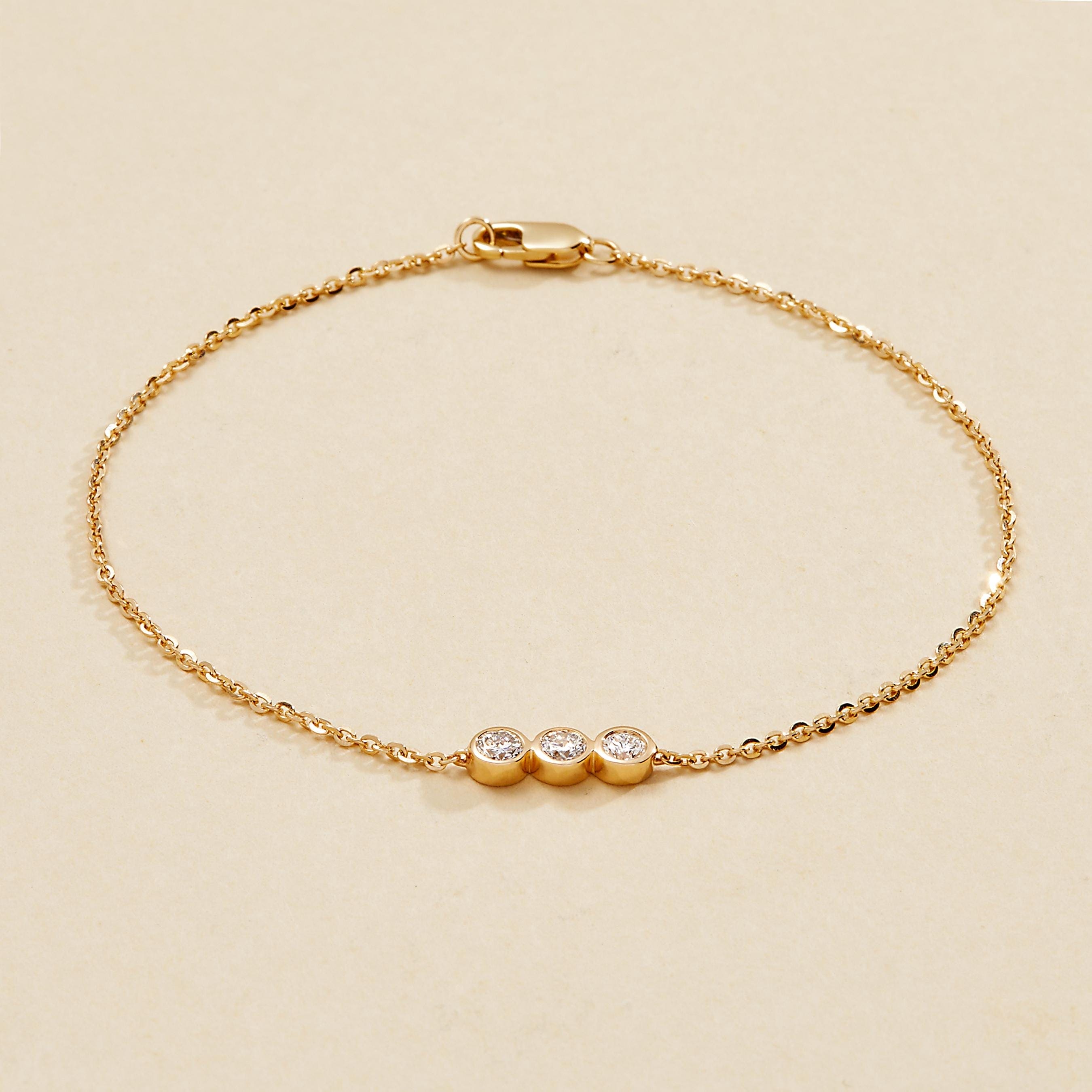 Our beautiful Minimalist 3 Bezel Set Lab Grown Diamond Bracelet, a perfect piece for gifting or treating yourself. Crafted in 14k yellow gold, this bracelet features three stunning bezel-set lab-grown diamonds, offering a timeless and elegant look that complements any outfit.