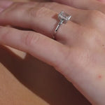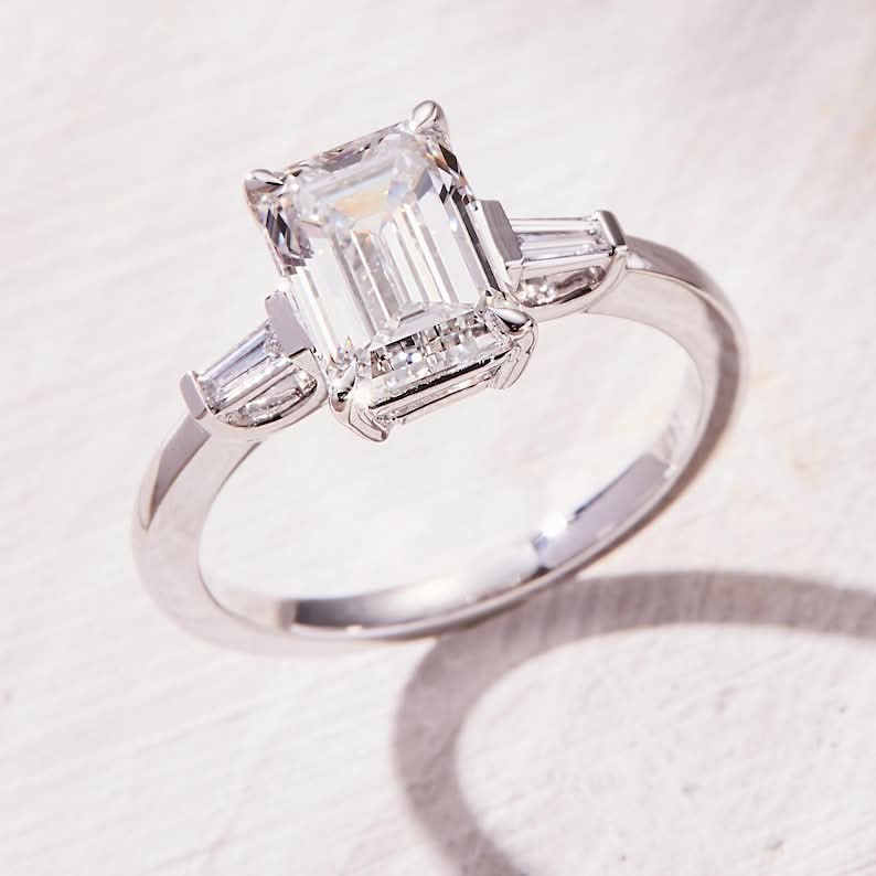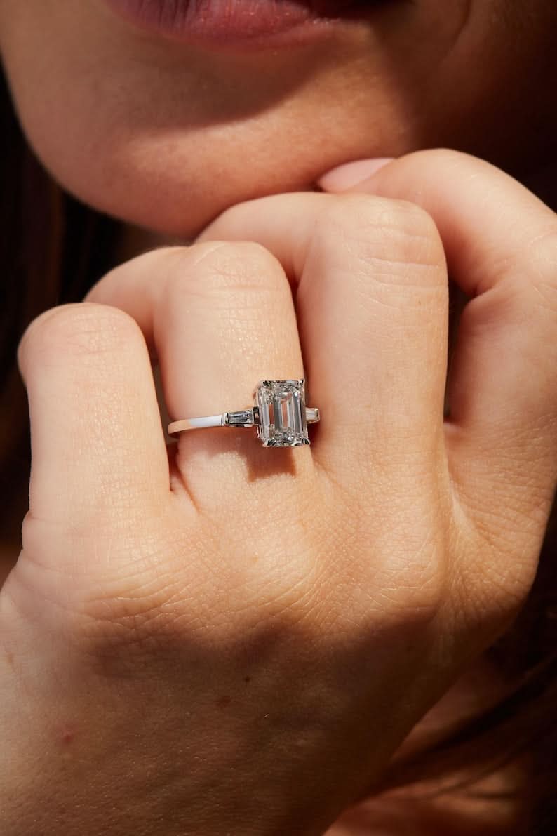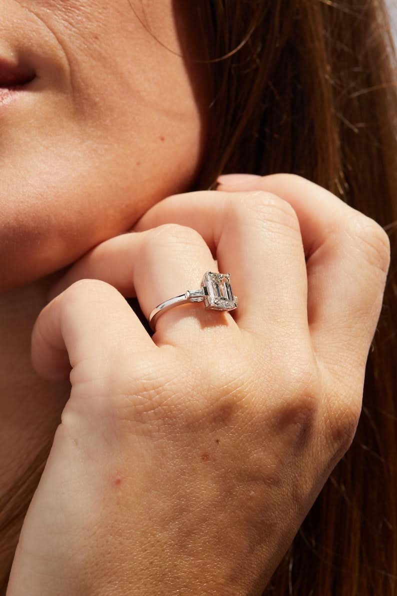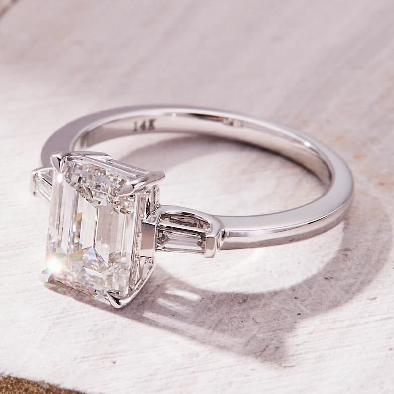 Introducing the timeless 2.00 Carat Emerald Cut Lab Grown Diamond Engagement Ring, featuring a G Color and VS2 Clarity center diamond in a classic three-stone setting. Accentuated by emerald baguette side stones, this IGI Certified ring is crafted in luxurious 14K White Gold, offering a perfect blend of elegance and sophistication.