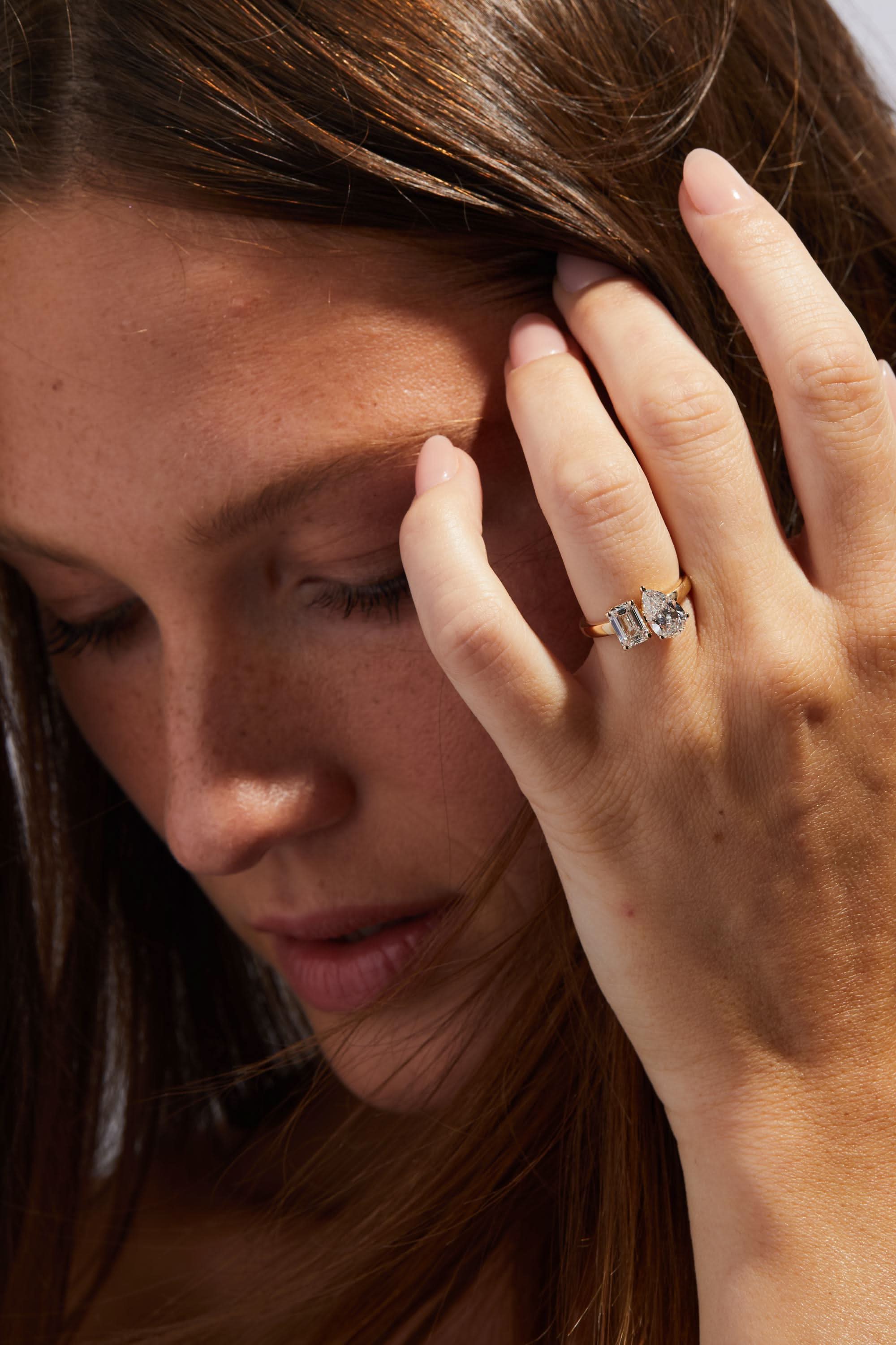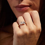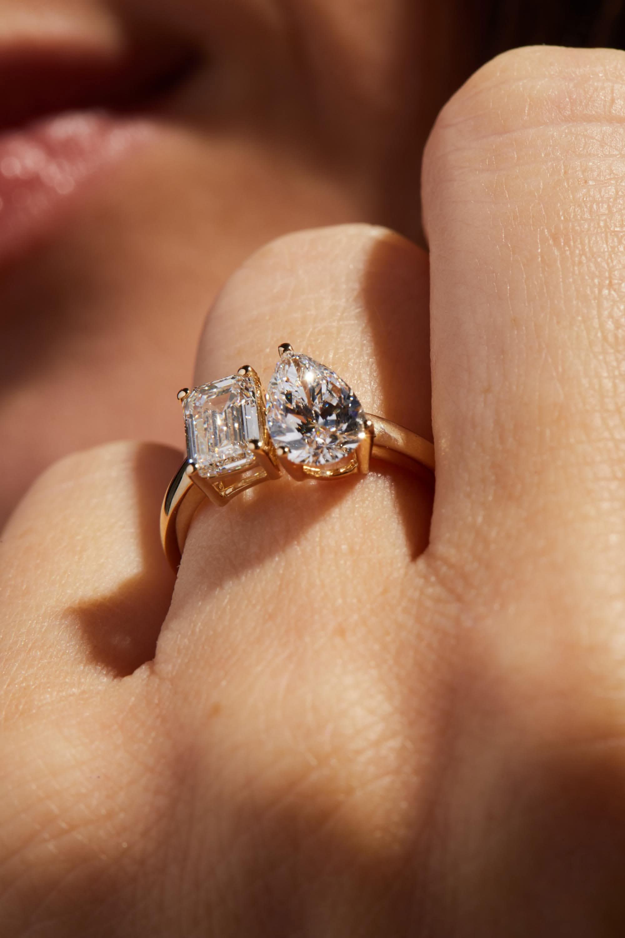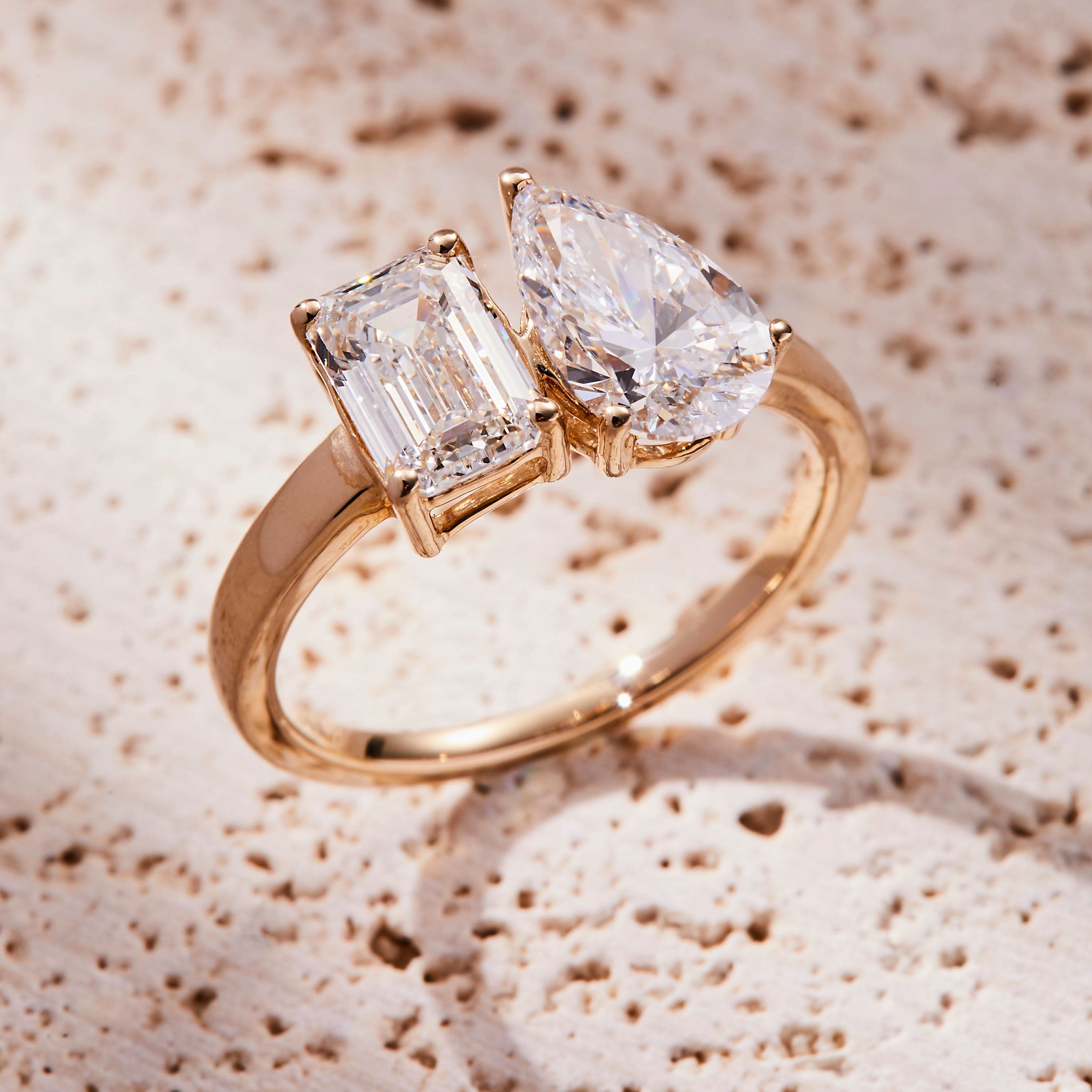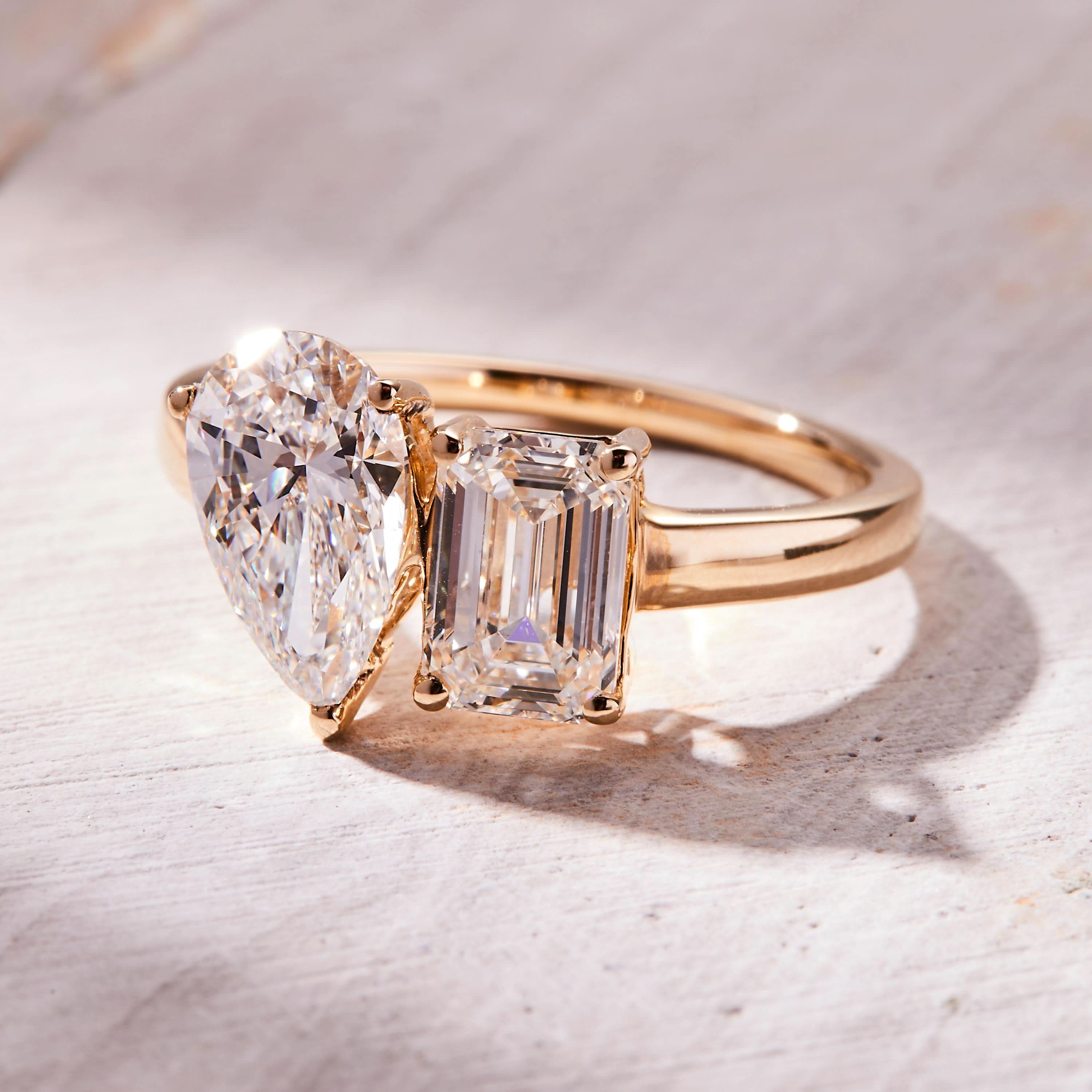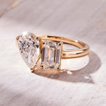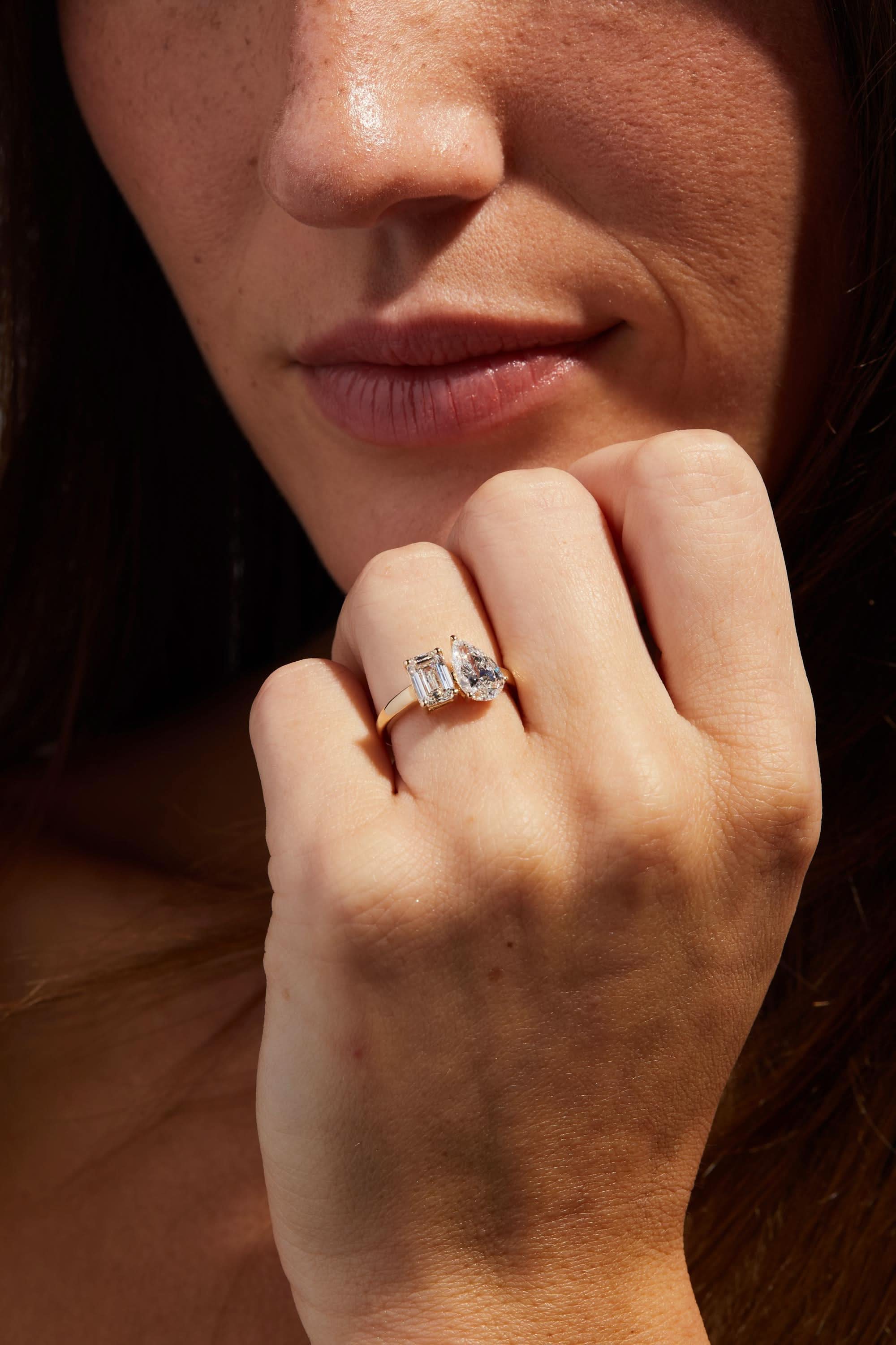 A stunning Toi et Moi engagement ring featuring two 1.00 carat lab-grown diamonds—a pear cut and an emerald cut—set in 14K yellow gold. With E color and VVS2 clarity, this IGI Certified ring symbolizes the union of two distinct souls, making it a meaningful and elegant choice for your special moment.