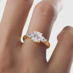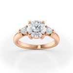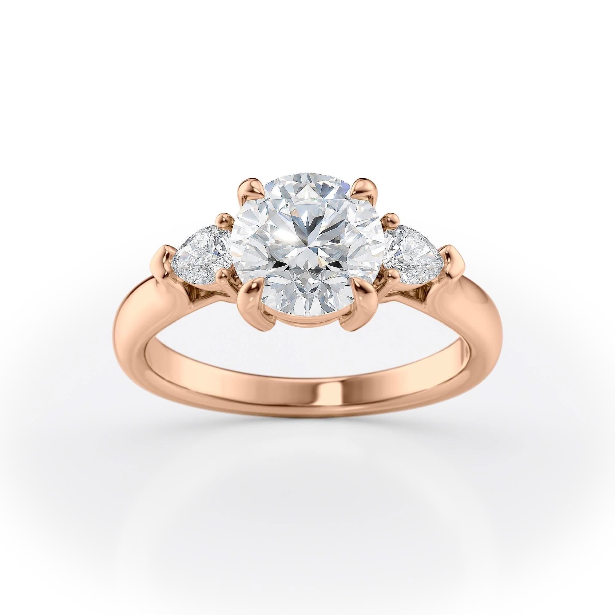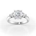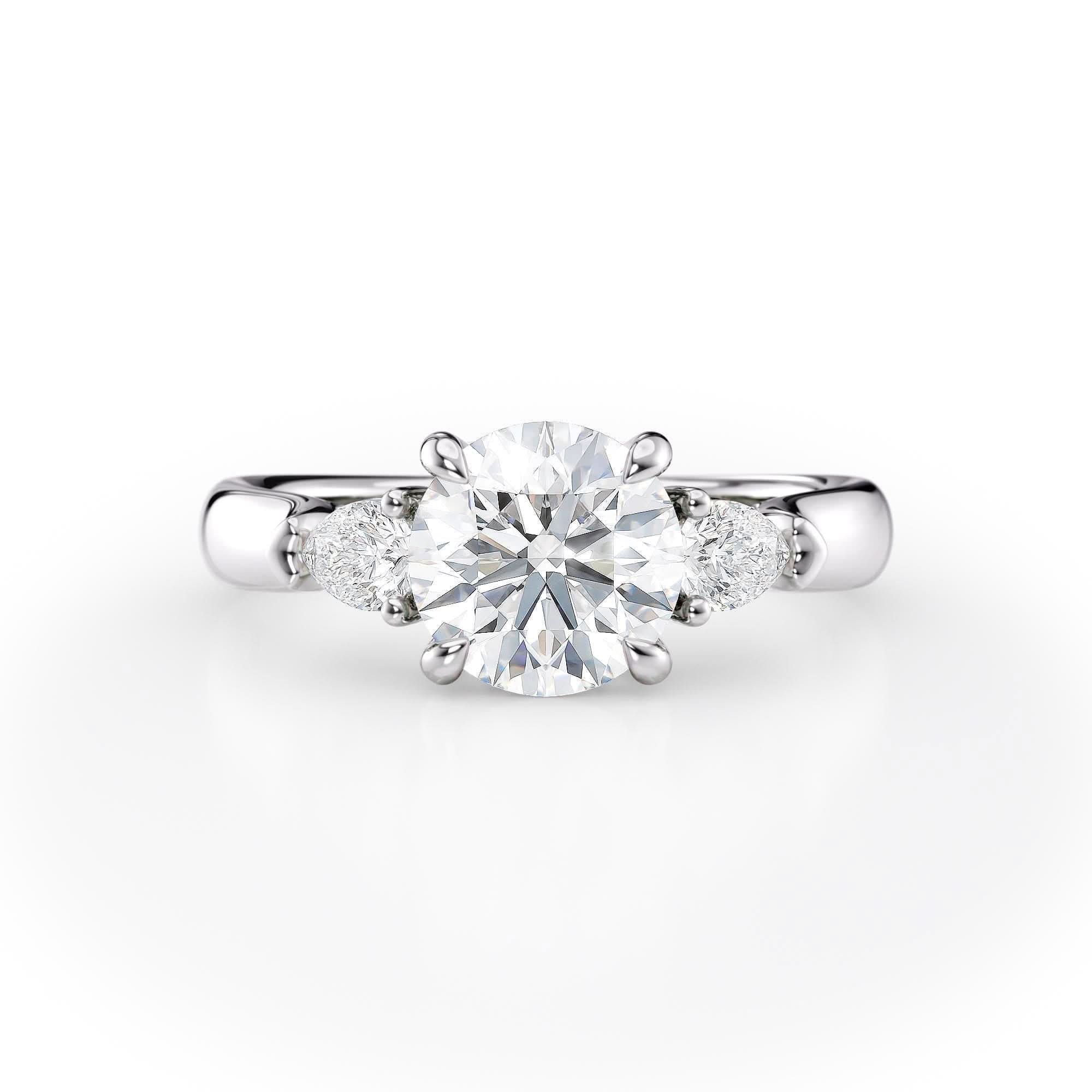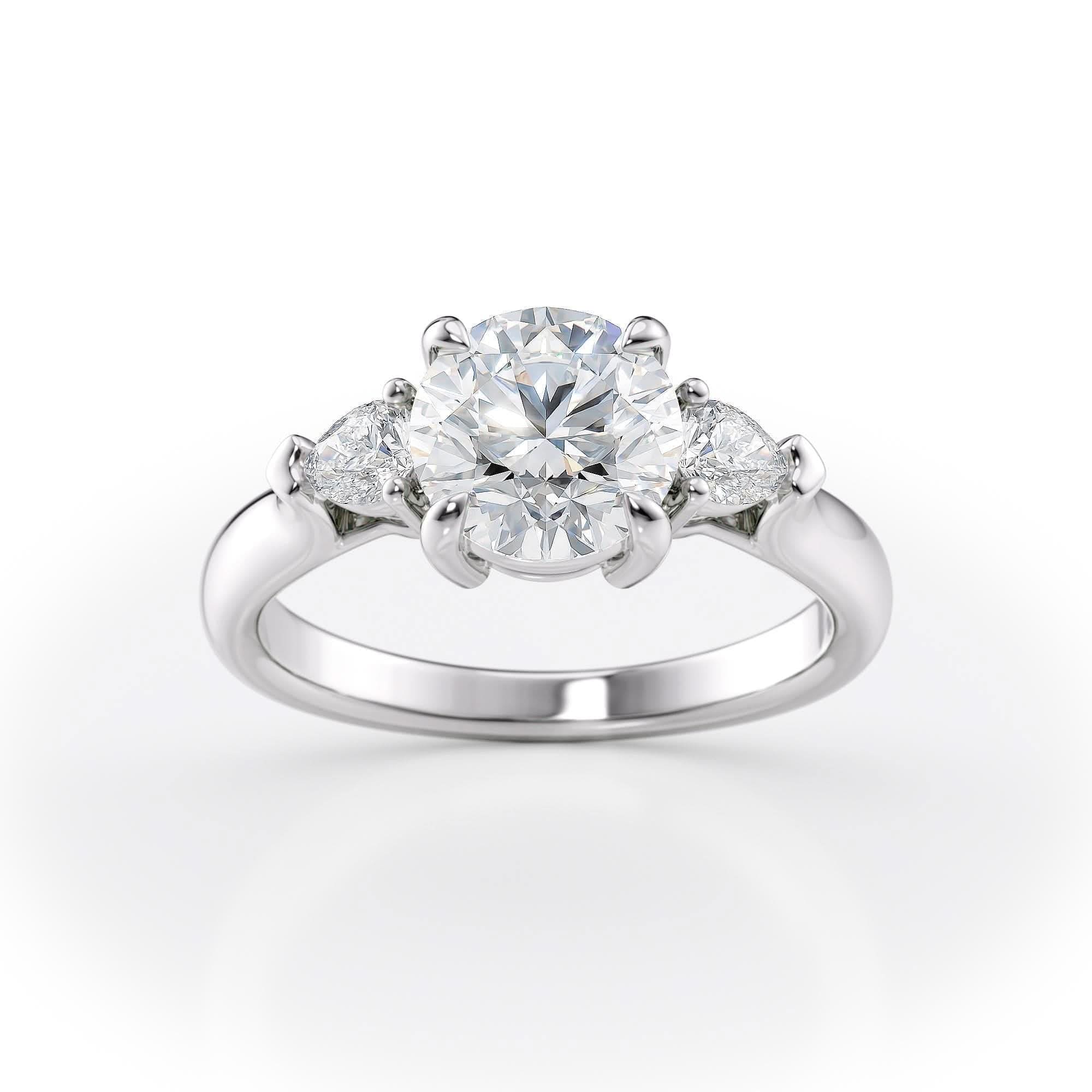 A timeless and elegant three-stone engagement ring designed to symbolize your past, present, and future together. This stunning piece features a 1.5ct round-cut lab-grown diamond (D, VS2) as the center stone, flanked by two 0.2ct pear-shaped diamonds for added brilliance and dimension. The sleek 2.10mm band, available in 14K yellow, white, or rose gold, adds a refined touch, making this ring a perfect choice for a lifetime of love.