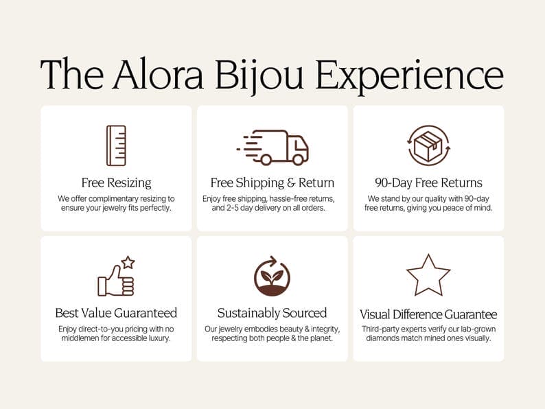 Each of our diamonds undergoes meticulous inspection by third-party jewelers, ensuring there are no discernible visual differences between mined and lab-grown diamonds. This commitment reflects our dedication to delivering exceptional quality and beauty. With Alora Bijou, luxury meets innovation seamlessly.